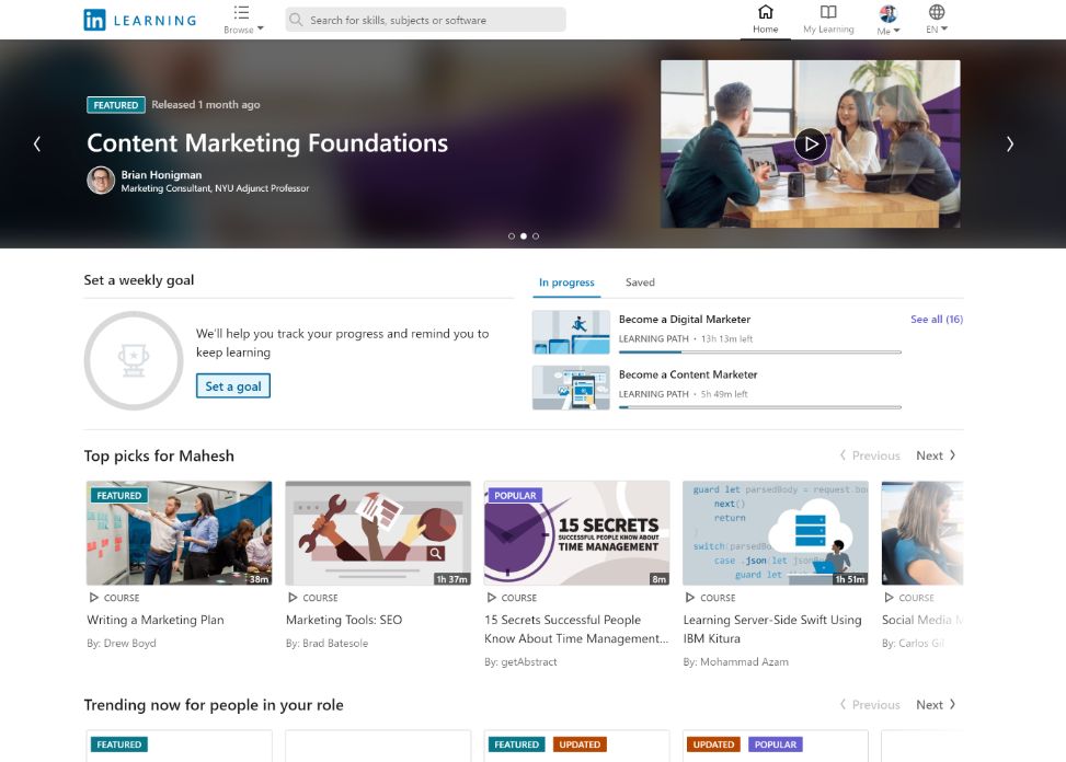 - Top courses based on your different skills: LinkedIn Learning helps to explore the courses to learn based on your different skills direct from the homepage. For example, if you are interested in Entrepreneurship, you will be recommended as “Learn Entrepreneurship, a top skill for people in your role”, or if you’ve selected ‘Communication’ skills as interest, it will recommend courses under “Because you’re interested in Communication”, and so on.