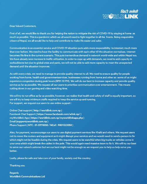 The ISP’s in Nepal are facing major issues as the demand as the supply status is imbalanced. There’s no point on blaming ISP’s as they were not prepared for this. Bhoj Raj Bhatta, President of ISPAN (Internet Service Providers Association of Nepal) said that in the peak hours the bandwidth consumption had increased by 22-25 percent within these few days. More bandwidth is consumed due to streaming (YouTube or any other streaming services). We urge everyone one of us to use the Internet wisely so that we can reduce the network stress.